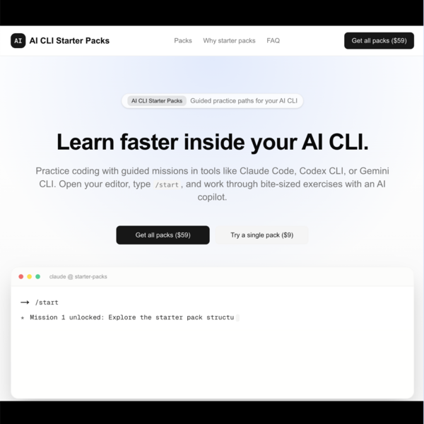 Unlock every AI CLI starter pack—present and future. Download → /start → build across the stack with an AI mentor that scales with you.